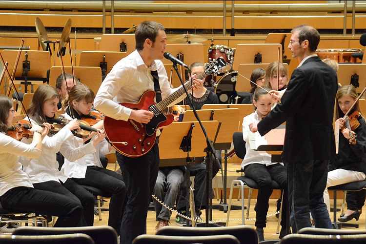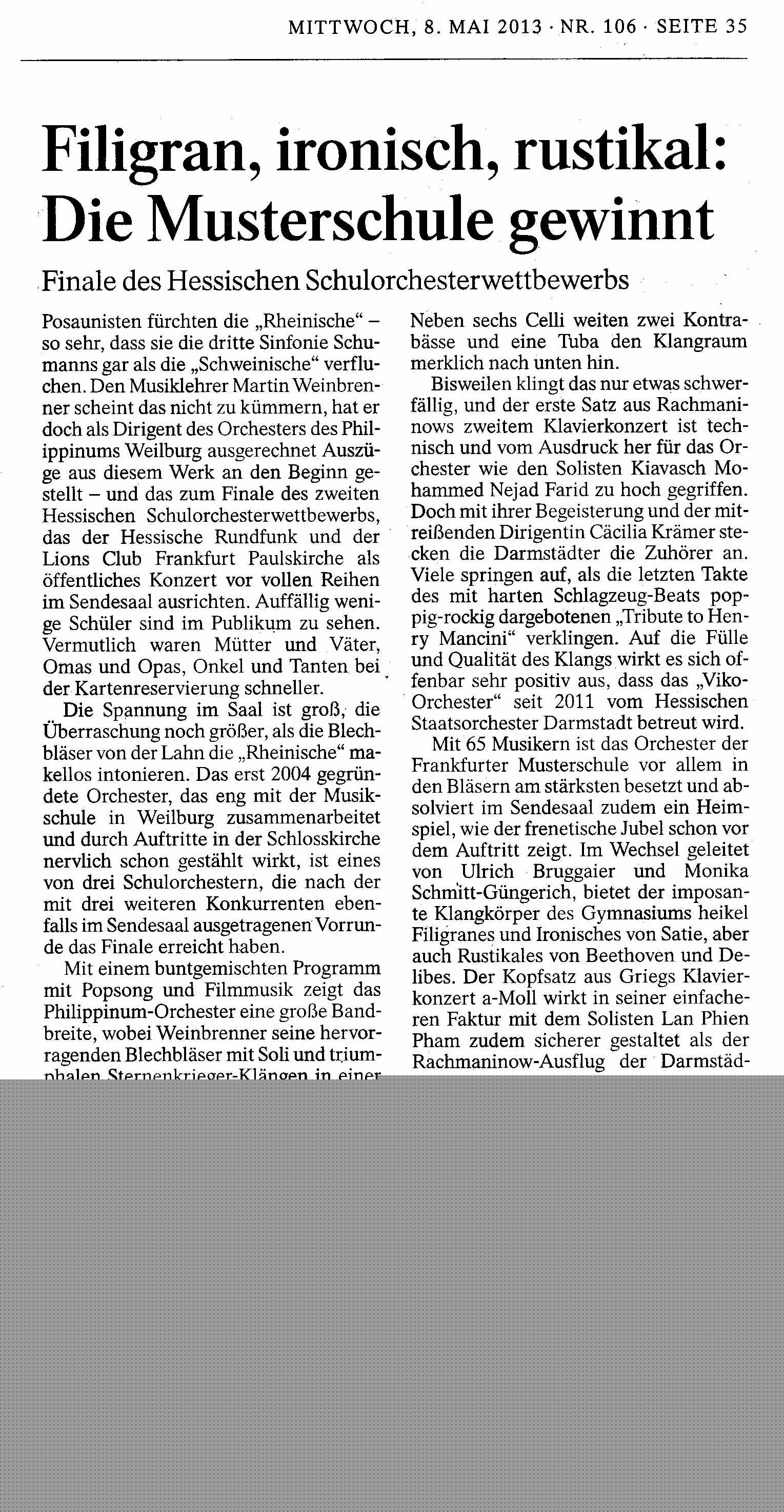 Schulorchester 2013Philippinum-Orchester im Finale! Drei Schulorchester sind bei der Vorentscheidung des 2. Hessischen Schulorchesterwettbewerbs am letzten Samstag weitergekommen, neben uns die Orchester der Darmstädter Viktoriaschule und der Musterschule Frankfurt: Das entschied eine Jury nach dem jeweils etwa zwanzigminütigen Vorspiel von insgesamt sechs hessischen Schulorchestern, die sich für den Vorentscheid am Samstag, 13. April, im hr-Sendesaal des Frankfurter Funkhauses qualifiziert hatten. Einen dritten Preis hat jedes dieser Orchester also schon mal sicher.Unser Vorspiel fand unter erschwerten Bedingungen statt: Binnen zwanzig Minuten musste nicht nur der Aufbau stattfinden, sondern auch der Soundcheck für das Gesangsstück mit Lars Kostjuschenko, sodass nur etwas drei Minuten Zeit dafür waren, sich an das Spielen im für uns ungewohnten Sendesaal des HR zu gewöhnen. Viele Spieler sagten, dass sie die Anderen nicht gut hören konnten und dass die akustischen Verhältnisse sie verunsichert hätten. Angesichts der eher selbstkritischen Einschätzung der eigenen Leistung war es umso großartiger für uns, als bei der Verkündung der Juryentscheidung der Name des Philippinum genannt wurde.„Dass es so tollen Nachwuchs gibt, das macht wirklich Mut. Wir haben so viel Spielfreude gesehen, so viele große Talente“, freut sich Andrea Zietzschmann, Orchestermanagerin des hr-Sinfonieorchesters und Juryvorsitzende des Wettbewerbs. Die drei Schulorchester werden am 5. Mai, 18 Uhr, zum öffentlichen Preisträgerkonzert im Sendesaal des Hessischen Rundfunks eingeladen. Das Konzert wird aufgezeichnet und später in Auszügen in hr2-kultur ausgestrahlt. Eine professionelle Aufzeichnung wird den Orchestern zur Verfügung gestellt. Eintrittskarten für das Konzert können im Vorverkauf bis zum 3.5.2013, 15:00 Uhr beim Förderverein des Lions Clubs Frankfurt Paulskirche e.V. über Herrn Manfred Waltz (Erwachsene / ermäßigt) bestellt werden (mail an: manfred.waltz@gmx.net). Ansonsten gibt es Karten für € 10,- / 5,- (erm.) an der Abendkasse ab 17:00 Uhr am Konzerttag.Martin Weinbrenner Bilder von der Generalprobe in der Weilburger Schlosskirche und vom Preisträgerkonzert am 5.5.13 im HR |