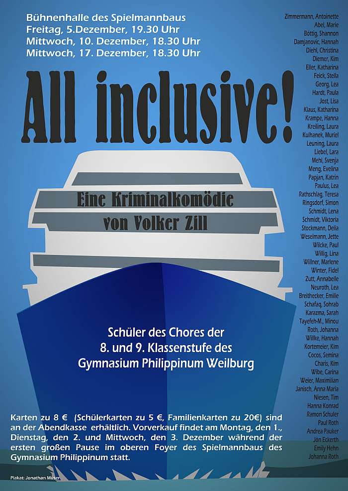 Musiktheater "All Inclusive"Mit der rasanten Krimikomödie "All inclusive" von Volker Zill haben die Schauspieler und der Chor der Klassenstufe 8 und 9 des Gymnasiums Philippinum das Publikum am Mittwoch im Spielmannbau begeistert. Auf der "Titanic" findet sich eine bunt gemischte Truppe an Passagieren ein, die nach Mallorca reisen möchten. Nach und nach checken alle ein und werden von der Kapitänin, gespielt von Theresa Rathschlag, und Schiffsstewardess Charis Kim als Hermia auf dem Schiff in Empfang genommen. Herr Schlipps alias Fidel Winter macht seinem Namen alle Ehre, denn er ist unterwegs in Sachen Import/Export und schafft es, während der Kreuzfahrt jedem Passagier eine seiner wundersamen Krawatten mit angeblicher Heilkraft anzudrehen. Ein älteres Ehepaar checkt ebenfalls ein, gespielt von Paul Willke und Antoinette Zimmermann, die mit ihrer sächsischen Aussprache die Lacher auf ihrer Seite hat. Dazu kommen zwei Workaholics, gespielt von Kim Diemer und Max Weier, die in derselben Firma um den Aufstieg konkurrieren und während der Fahrt feststellen, dass sie tatsächlich im selben Boot sitzen. Familie Runstädt, Lea Paulus, Tim Niesen und Jette Weselmann, macht von Anfang an klar, dass sie von und zu heißen und auch so behandelt werden möchten. Die Eltern möchten ihre Tochter von ihrer Wasserphobie heilen. Mit dabei ist auch Hündchen Prinzessin. Zu guter Letzt geht die Prollfamilie Böller an Bord, gespielt von Lea Georg, Simon Ringsdorf, Minou Tayefeh sowie Mahmoudi und Sorab Schafaq, die die Reise im Preisausschreiben gewonnen hat. Dass es bei dieser Gruppe zu Streit kommt, ist vorprogrammiert. Als dann auch noch Gegenstände verschwinden, liegen dieNerven auf allen Seiten blank. Für noch mehr Verwirrung sorgt die blinde Passagierin, Paula Hardt, die am Ende zugibt, die Gegenstände gestohlen zu haben. Als Hündchen Prinzessin verschwindet, outet sich die Schiffsstewardess als Soko-Mitarbeiterin, die schon lange nach einer Juwelendiebesbande sucht. Sie deckt auf, dass die Bande die Juwelen Prinzessin um den Hals gehängt hat und jetzt Familie Runstädt verfolgt, um sich die Beute wiederzuholen. Dann herrscht Tohuwabohu, denn die Täter müssen an Bord sein und alle beschuldigen sich gegenseitig. Plötzlich enttarnt sich das "alte" Ehepaar, zückt Gewehre und treibt die Crew und die Gäste in die Sauna. Während sie dort gefangen sind, geschieht Wundersames. Alle sind lieb zueinander, entschuldigen sich und vermuten, dass das an den heilenden Krawatten liegt. Schlipps gibt kleinlaut zu, dass es nur normale Schlipse sind, aber das interessiert niemanden mehr. Die blinde Passagierin ergattert unterdessen die Gewehre, befreit die Eingeschlossenen und Hermia überwältigt die Diebe. Es gibt ein Gerangel, der Hund geht über Bord. Die Tochter der Runstädts, die an Wasserphobie leidet, springt beherzt hinterher, rettet ihre Prinzessin und ist zudem von ihrer Phobie geheilt. So ist am Ende der Kreuzfahrt alles gut, die Diebe gefasst, die Passagiere miteinander befreundet. Zwischen den Szenen singt der Chor der 8. und 9. Klassen thematisch passende Lieder und führt so musikalisch durch das Stück. Begleitet wird der Chor von der Lehrerband, am Bass Georg Lorenz, am Schlagzeug Thorsten Neischwander und am Klavier Oliver Blüthgen unter der musikalischen Leitung von Christiane Glotzbach. Regie führt Michael Glotzbach. Die Bühnenbau-AG sorgt für den passenden Bühnenaufbau. |