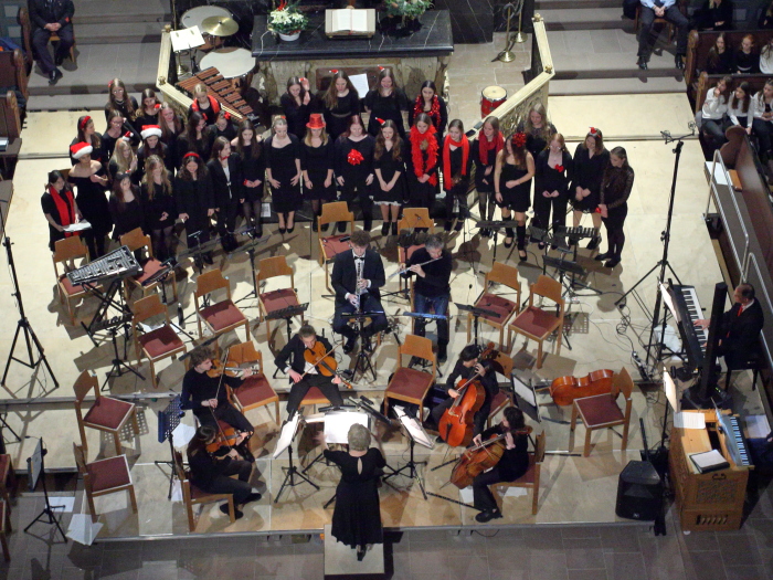 Das Weilburger Tageblatt schrieb: Philippinum-Schüler zeigen in Weilburg ihr KönnenEin stimmungsvolles Weihnachtskonzert des Gymnasiums erlebt das Publikum in der Schlosskirche. Das Orchester und die Chöre musizieren zum Abschluss gemeinsam "Beauty Of The Earth". WEILBURG. Lang anhaltender Applaus, Beifallsstürme, Standing Ovations: Schüler des Gymnasiums Philippinum Weilburg haben sich mit Eltern, Ehemaligen und Freunden in der Schlosskirche auf Weihnachten eingestimmt. Nach einem Orgelvortrag von Leonard Gürtel präsentierten sich in diesem festlichen Konzert alle Musik-AGs der Schule - von den Singklassen 5 und 6 mit stimmungsvollen Vorträgen bekannter Weihnachtshits über den Philippinum-Chor, dem Blechbläserensemble bis hin zum großen Orchester. Neben zwei Solokonzerten mit den Solisten Elisabeth Kuhnigk (Blockflöte) und Lucas Mallebré (Posaune) präsentierten sich Formationen in kleiner Besetzung: ein glockenklar singender Knabenchor und ein Männerensemble, das mit "The Rose" sein Publikum durch mystische Klänge verzauberte. Klangvoll und intonationssicher mit "Wondering" stellte sich der Chor der Klassenstufe 7 dar. Amerikanisches Flair verbreiteten die Philippinum-Voices mit der schwungvollen Nummer "Frosty The Snowman". Dass das Corona-Tief endlich überwunden ist, wie Schulleiter Stefan Ketter sagte, zeigten auch die Beiträge des Philippinum-Chors, die stilsicher und klangvoll die Schlosskirche füllten. Das Orchester zeigte seine Vielseitigkeit in einem Filmmusik-Medley und einem klassischen Sinfoniesatz von Schumann. Die Stimmgruppen ergänzten sich zu einem harmonischen Zusammenklang. Die Holz- und Blechbläser bildeten eine Einheit mit Schlagwerk und Streichern. Den krönenden Abschluss des Konzerts bildete der letzte Programmpunkt: Das Orchester und alle Chöre musizierten gemeinsam "Beauty Of The Earth" von John Rutter. |