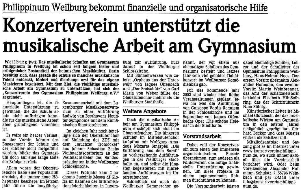 Weilburg (wt). Das musikalische Schaffen am Gymnasium Philippinum in Weilburg ist schon seit langem fester und erfolgreicher Bestandteil der heimischen Musikkultur. Darifn bestätigt sich, dass gerade die Schule so manches musikalische Talent entdeckt, fördert und überhaupt erst für die das eigene Musizieren begeistert. Mit dem Ziel, die vielfältige musikalische Arbeit am Gymnasium zu unterstützen, hat sich der "Konzertverein des Gymnasium Philipppinum Weilburg e.V." gegründet. [...]